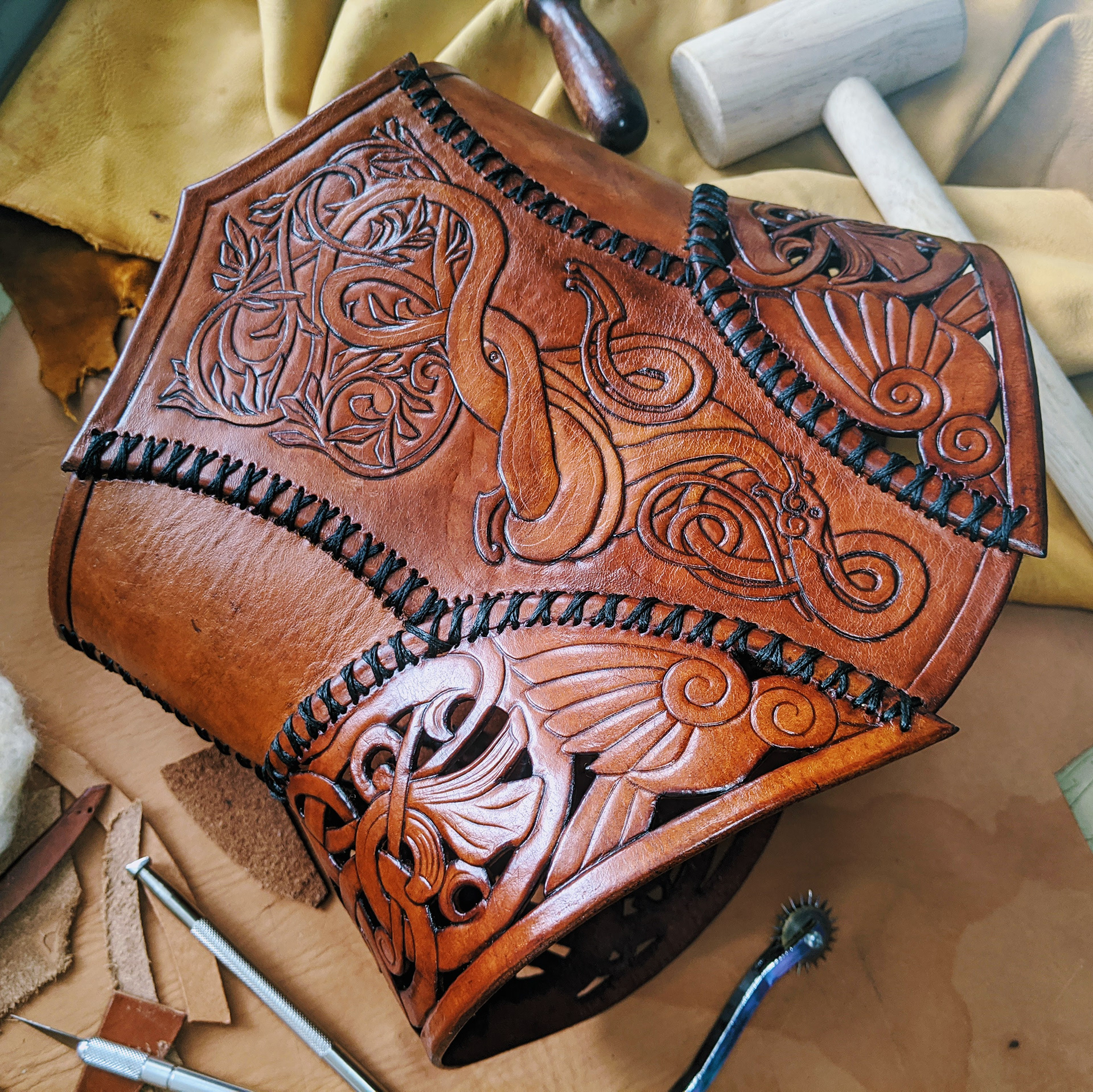Process: Leather corset hand-tooled, cut, stained and glossed, and sewn together